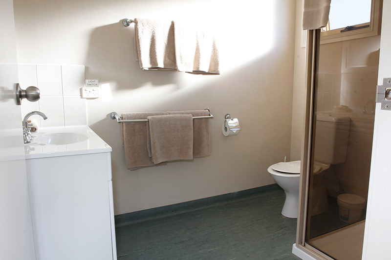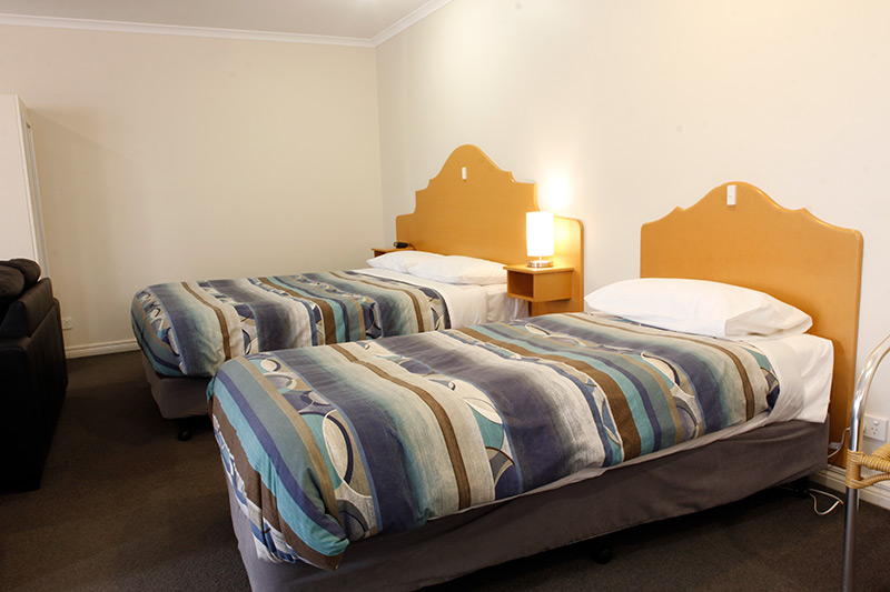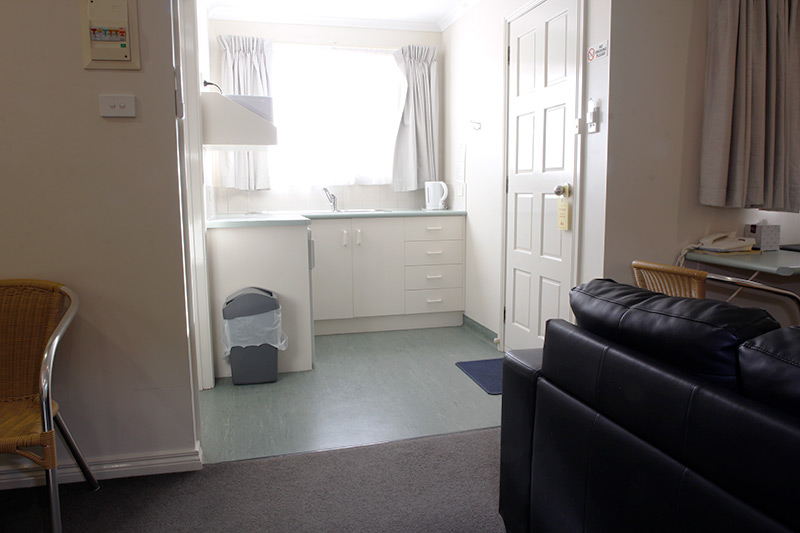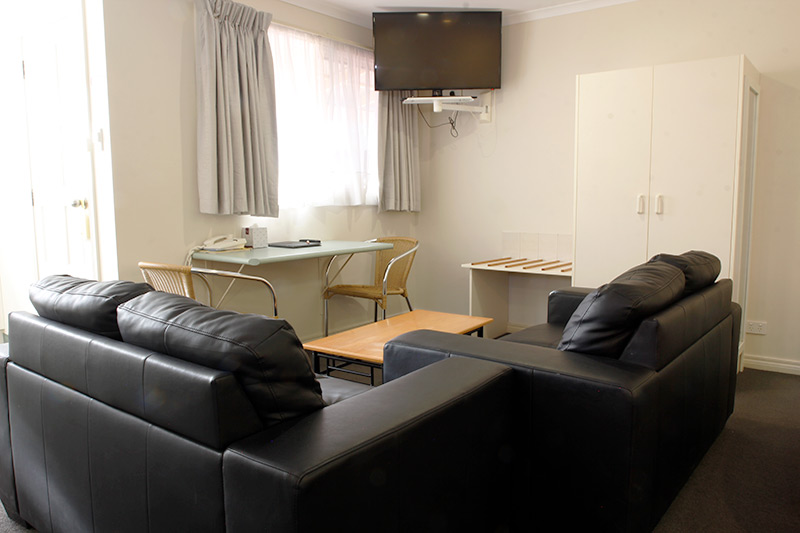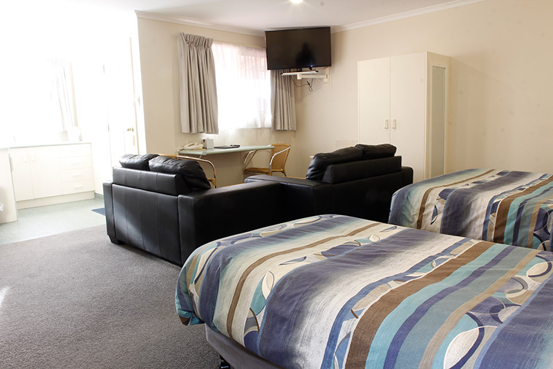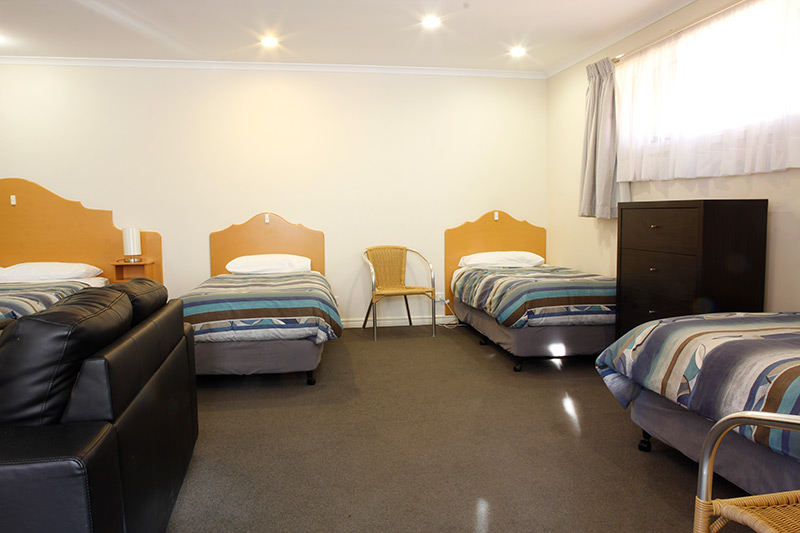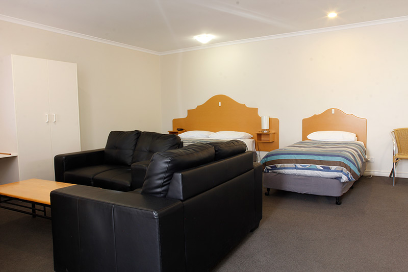 Studio Family is comfortable with kitchenette – microwave, kettle and toaster (no cook top or oven), queen bed (partition separates three single beds) and en-suite bathroom.