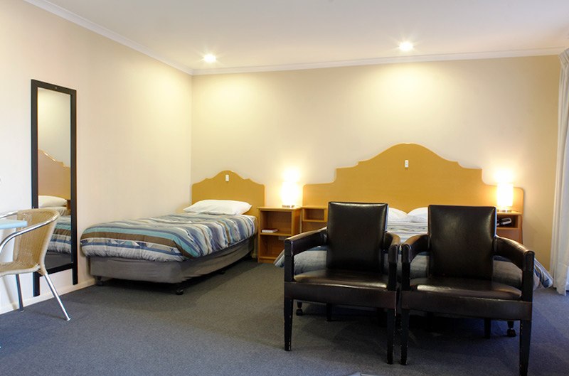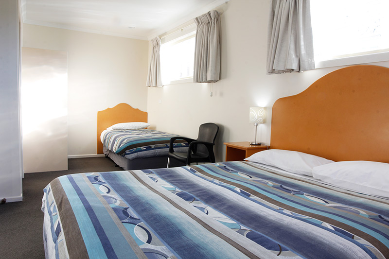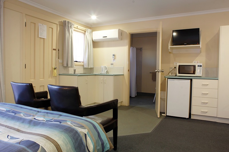 Studio Twin is a comfortable room with kitchenette – microwave, kettle and toaster (no cook top or oven), TV, queen bed, single bed and en-suite bathroom.